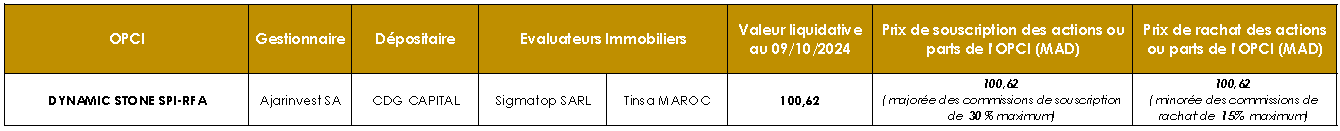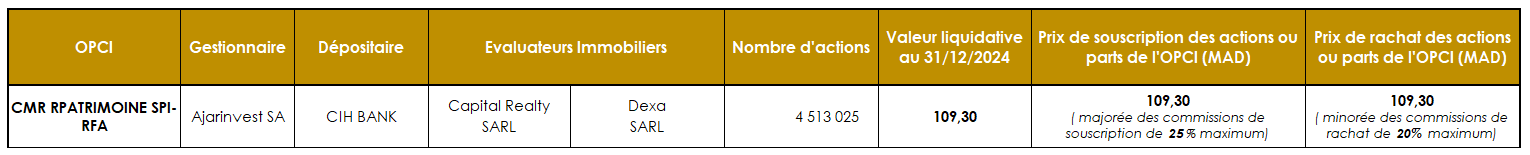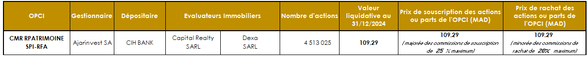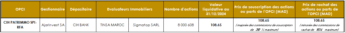L’Autorité Marocaine du Marché des Capitaux (AMMC) a accordé en date du 27 décembre 2019, sous la référence n°AG/SPI/002/2019, le deuxième agrément d’Organisme de Placement Collectif en Immobilier au Maroc, à Ajarinvest pour son OPCI « CIH PATRIMMO » de type OPCI à Règles de Fonctionnement Allégées (OPCI RFA), portant sur des agences commerciales immobiliers détenues par CIH Bank.