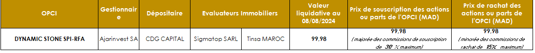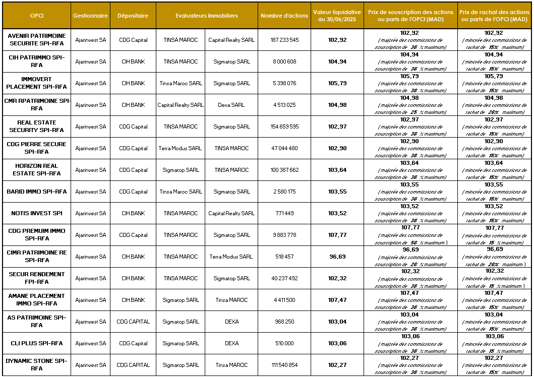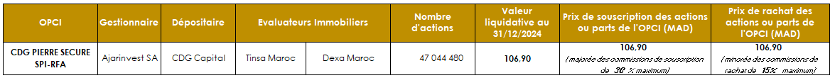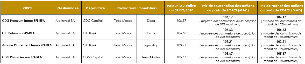 L’Autorité Marocaine du Marché des Capitaux (AMMC) a accordé en date du 26 juin 2020, sous la référence n°AG/SPI/002/2020, le quatrième agrément d’Organisme de Placement Collectif en Immobilier au Maroc, à Ajarinvest SA pour son OPCI « CDG PIERRE SECURE » de type OPCI à Règles de Fonctionnement Allégées (OPCI RFA).